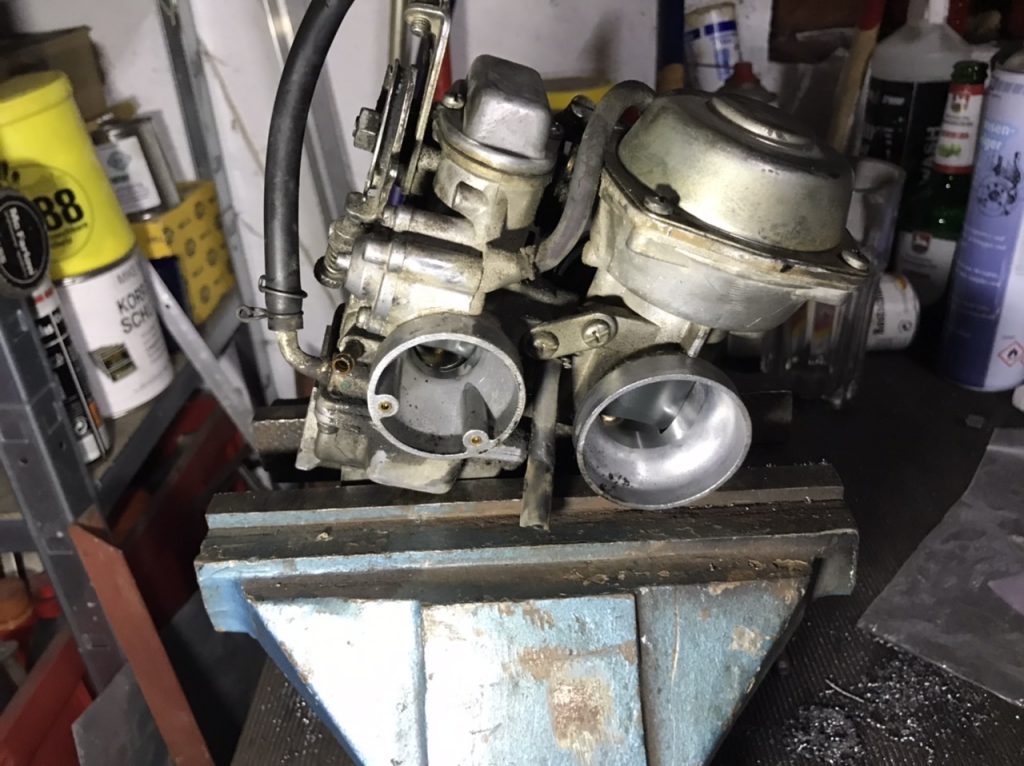 Jetzt wird’s lustig – es ist wirklich sau eng. Der Sekundärvergaser steht mit seinem großen Deckel sofort am Rahmenrohr an. Es geht aber, wenn man entgegen der Intuition den Vergsaser erst hinten nach oben kippt, bis er vorne aus den Ansaugstutzen rutscht. Dann kann man den Vergaser nach rechts drücken.